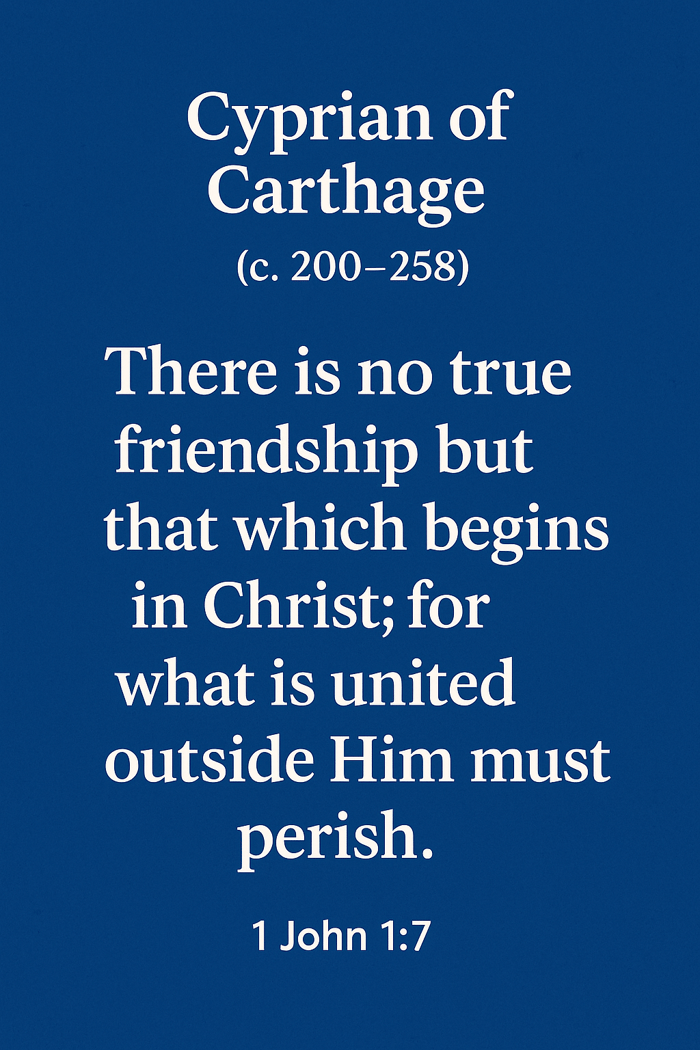 Cyprian of Carthage (c. 200–258) | “There is no true friendship but that which begins in Christ; for what is united outside Him must perish.” Scriptural Basis: 1 John 1:7 |