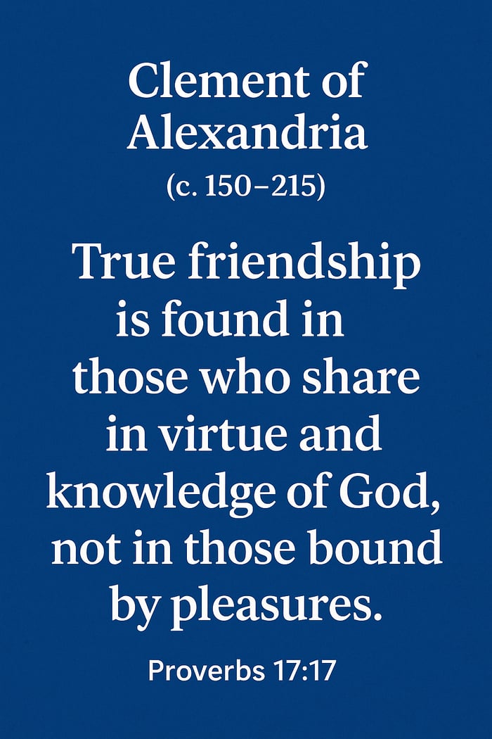 Clement of Alexandria (c. 150–215) | “True friendship is found in those who share in virtue and knowledge of God, not in those bound by pleasures.” Scriptural Basis: Proverbs 17:17 |