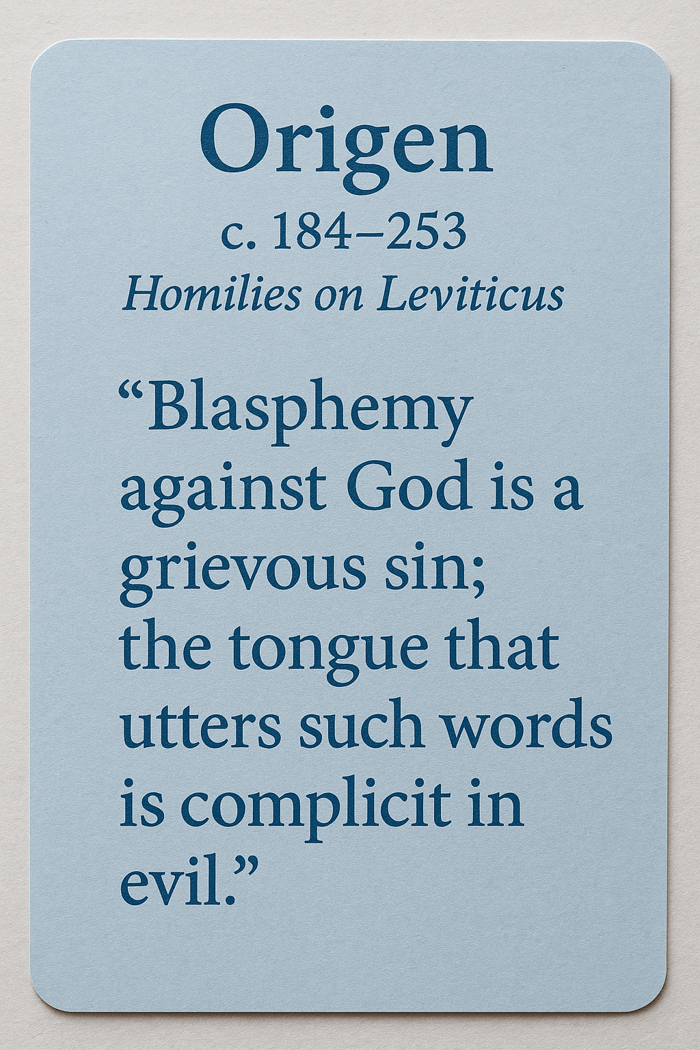 | Origen (c. 184–253, Homilies on Leviticus) | “Blasphemy against God is a grievous sin; the tongue that utters such words is complicit in evil. Context/Meaning: Directly targeting God with words is a mortal offense; verbal sins affect inner life.” |