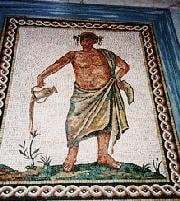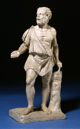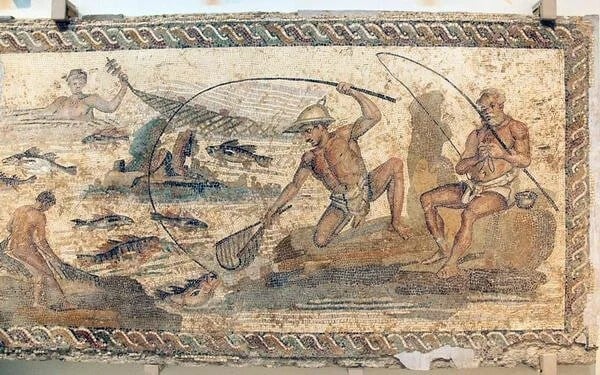 Picture of barechested fisherman in 1st Century Rome selling on land, not on his boat while fishing. He is lightly clad. Image is courtesy of the British Museum