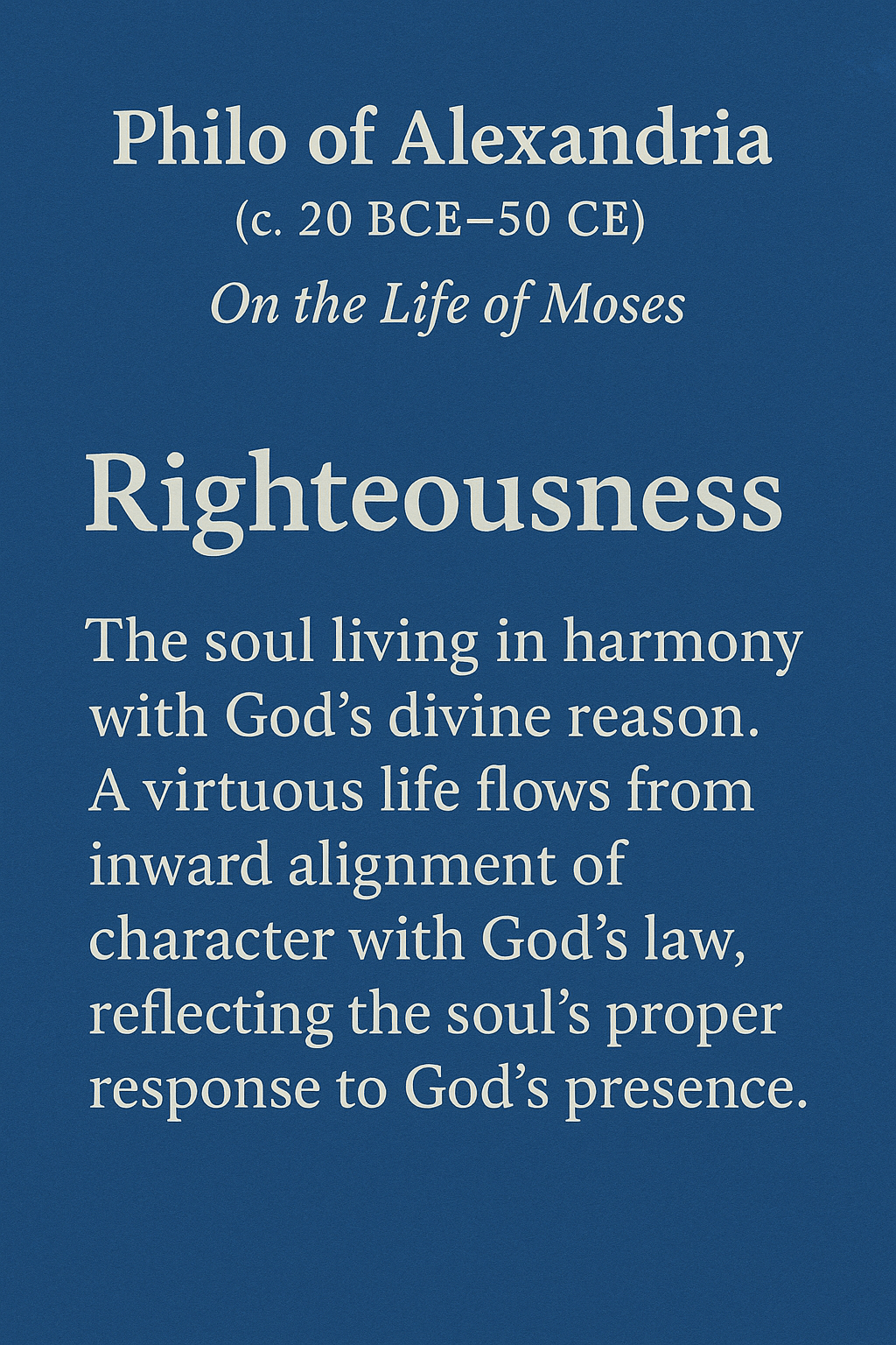 | Philo of Alexandria (c. 20 BCE–50 CE) On the Life of Moses | Philo presents righteousness as the soul living in harmony with God’s divine reason. He emphasizes the inward alignment of character with God’s law, showing that a virtuous life is the soul’s proper response to God’s presence. The righteous man lives according to reason, and in so doing he becomes a companion of God, sharing in the divine likeness |